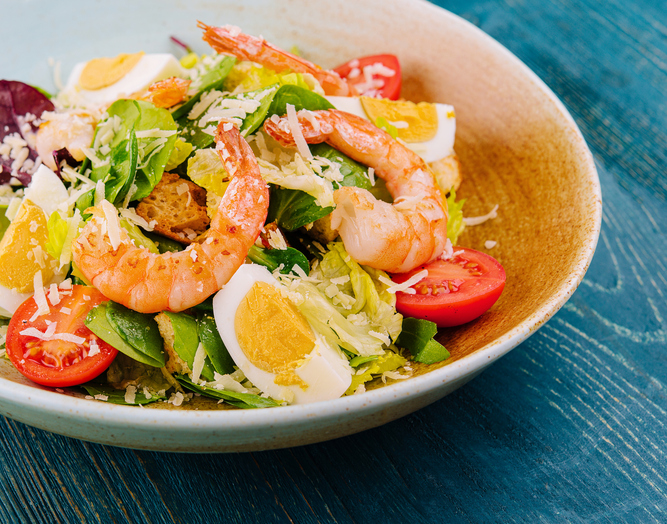 Jika kita merebus atau memanggang daging ayam atau makanan laut dan menambahkannya ke salad, kita akan mendapatkan salad sehat yang dapat memenuhi kebutuhan protein dan mengatasi rasa lapar. Protein membutuhkan waktu untuk dicerna, sehingga rasa kenyang akan bertahan lebih lama. Jika kita merebus atau memanggang dada ayam, salmon, udang, dll, rasa salad akan lebih harmonis.